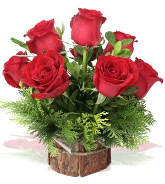 O poder das rosas vermelhas para emocionar neste dia dos Namorados: belo arranjo com lindas e sofisticadas rosas importadas em um cachepot rústico de casca de árvore é uma opção para enviar sua mensagem romântica... Aproximadamente 35 cm. de altura.